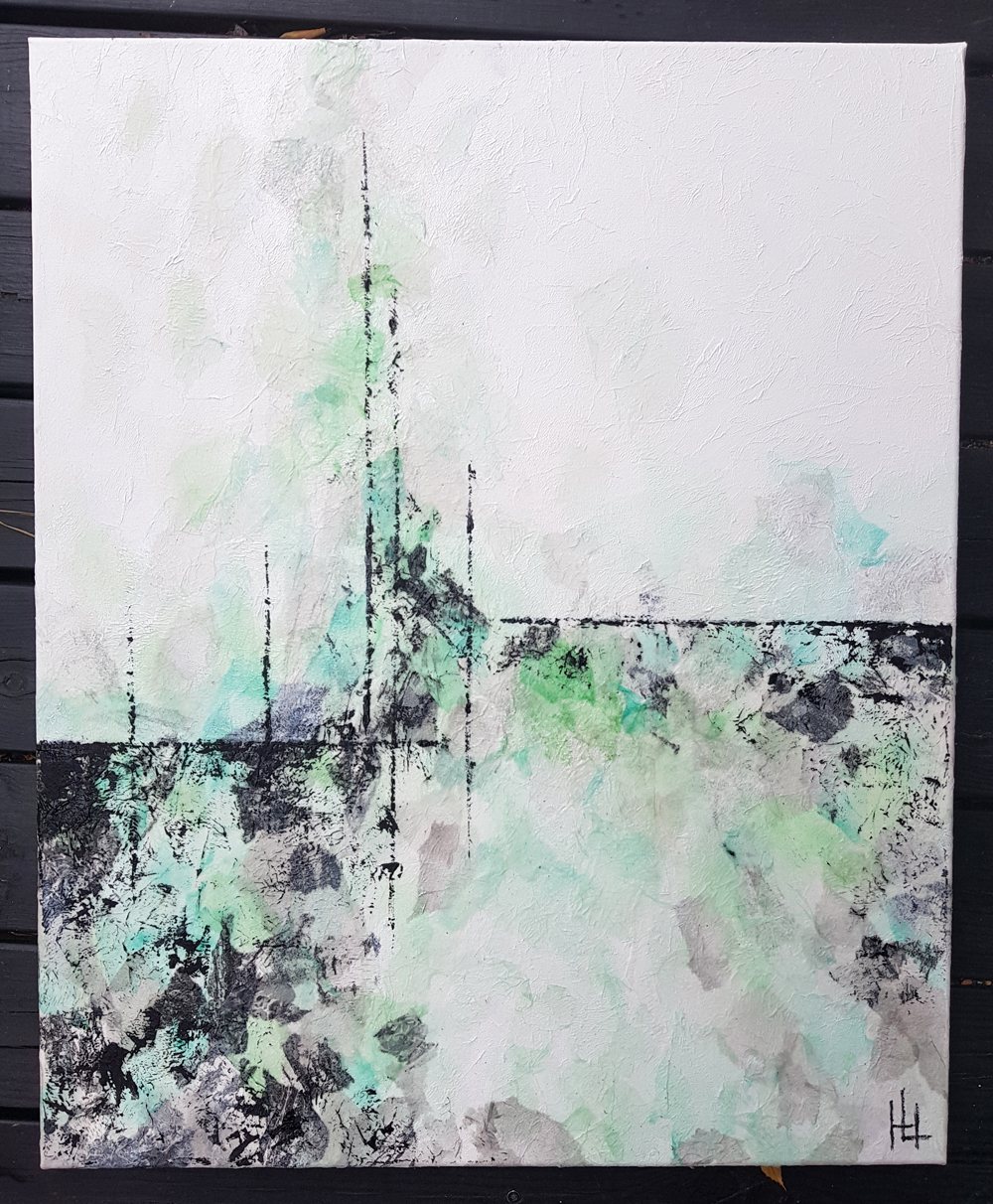 Työn pohjalla tauluni ”Mint” johon asiakas oli ihastunut. Nimi ja muoto liittyvät asiakkaan elämäntilanteeseen.