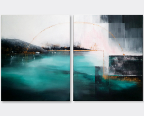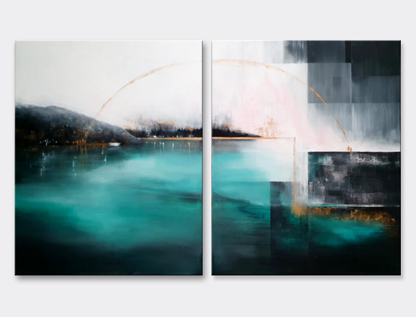 Täytyy sanoa että yksi vaikeimmista, mutta sitä myötä myös yksi hienoimmista tilaustöistäni. Kultaisina täplinä oikeanpuoleisessa taulussa on Hannele ja hänen tyttärensä, vasemmanpuoleisessa taulussa samalla tavalla esitettynä Eero ja hänen kolme poikaansa. Ja on siellä vähän saarta ja venettä. Ja kultaista kaarta ja reittiä yhdistämässä nämä kaksi.